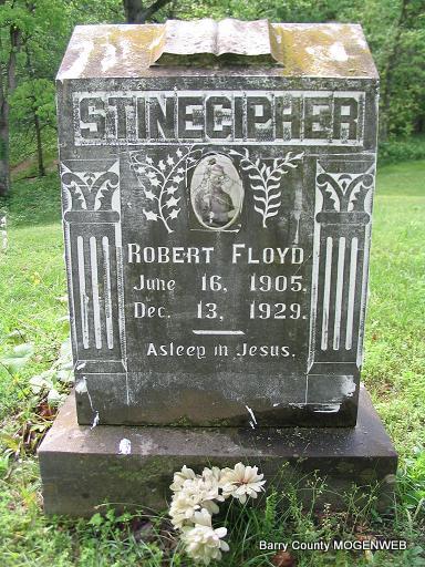 Research Note: This was my uncle and the son of Joseph Albert and Nancy Charlotte Stinecipher. He died as a result of an injury caused by a horse that kicked him in the head. He married Florence Nellie Taylor, Oct. 1925. They had a baby boy that died at birth Apr. 26, 1909 and is buried in the Cargile cemetery. His death certificate reports his parents as Joseph A. and Nancy (Monday) Stinecipher. His death certificate is indexed by the Secretary of State's office as Stinesipher. It reports that he and both of his parents were born in Dallas Co., MO. Charley Stinecipher of Washburn, gave the information. | Headstone Mary Homesley Family Files Death Certificate Lonnie Stinecipher Photo Phyllis Long |