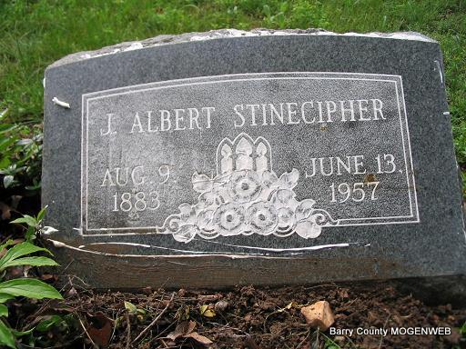 Research Note: Headstone reads J. Albert Stinecipher. This is my grandfather. He was called "Abe" by most. His death certificate reads that his father was R. E. Stinecipher and that his mother's name was unknown to the informant. Congestive heart failure was the cause of death. Nancy Charlotte was his wife's name. He was widowed and a retired farmer. Charley Stinecipher of Washburn, MO, was the informant. The date of his birth is given as 1873 not 1883 as the stone reads. | Headstone Mary Homesley Family Files Lonnie Stinecipher Death Certificate Photo Phyllis Long |