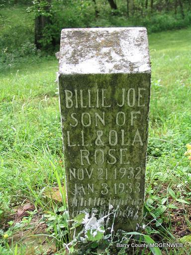 Inscription: "Son of L. L. and Ola Rose, A Little Time On Earth He Spent Till God For Him His Angel Sent" - Research Note: Son of Lemma Lester Rose and Ola Pippin. After Billie Joe's death, Ola said that she had used one of Nina's gowns on him and never again would any of his or Nina's clothes be used for the other children. | Headstone Mary Homesley Family Files Photo Phyllis Long |