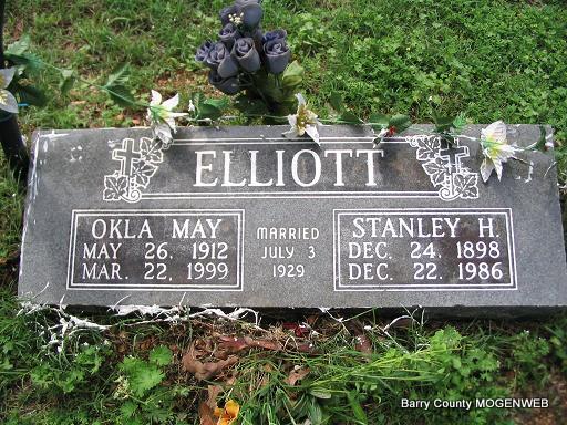 SSW: Okla May - Inscription: "Married July 3, 1929" - Research Note: Son of Seymour Alfred Elliot and Emma Vaught. - 1930 Census, Otto, Santa Fe, New Mexico - Stanley H. Elliot, head, age 31, married at age 30, born TN; Okla, wife, age 17, married at age 17, born OK; Wanda M., daughter, age 0. - 1940 Census, Mesa, Roosevelt, New Mexico - Stanley Hume Elliot, head, age 41, born TN, farmer; Okla May, wife, age 27, born OK; Wanda May, daughter, age 10, born NM; Stanley Hume Jr., son, age 8, born NM; Sharon Ann, daughter, age 1, born NM. - Sharon Ann married Johnny Townsend and both are buried at Cargile Cemetery. | Headstone Mary Homesley Census WWI Draft Reg. Photo Phyllis Long |