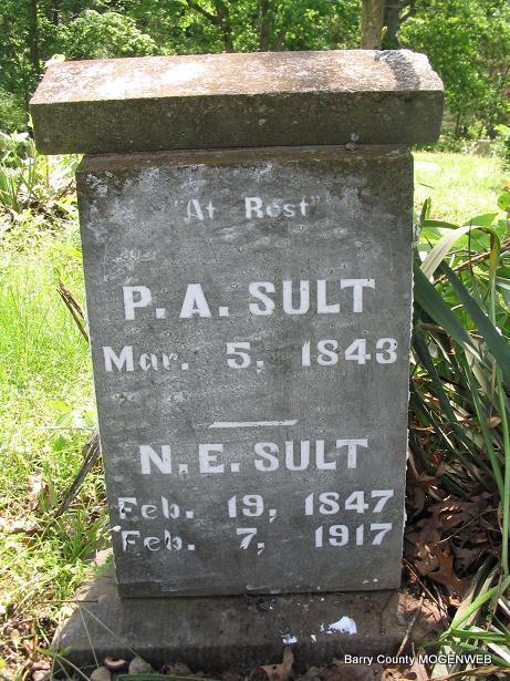 SSW: N. E. - Research Note: A death certificate is registered for Peter A. Sults, who died in Barry County, Feb. 15, 1937. There is a listing for Peter A. Sult in the 1909 plat map for P. A. Sult. - 1910 Census, Ash, Barry, Missouri - William Allen, head, age 81, married once for 50 years, born MI, mother born MI, farmer; Peter Sult, boarder, age 65, married twice present marriage 30 years, born IN, miner-prospecting; Nancy Sult, boarder, age 61, married twice, present marriage 30 years, mother of 4 children, 3 living, born PA, father born PA; Edward Rich, boarder, age 53, widowed, born IL, miner-prospecting. - 1920 Census, Ash, Barry, Missouri - Ed M. Rich, head, age 60, born IL, father born NY, mother KY, farmer; Peter A. Sult, boarder, age 76, born IN, widowed, mother born PA. - 1930 Census, Ash, Barry, Missouri - E. M. Rich, head, age 75, first married at age 24 born IL, father born NY, mother KY, farmer; Sarah, wife, age 57, first married at age 51, born MO, father born MO, mother IN; P. A. Sult, lodger, age 87, widowed, first married at age 26, born IN, father born At Sea, mother PA. | Headstone Mary Homesley Death Certificate Census Donna Cooper Photo Phyllis Long |