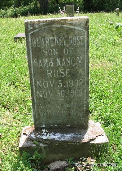 Inscription: "Son of Sam and Nancy Rose, Gone To A Better Land" - Research Note: Son of Samuel Morgan Rose and Nancy Laurana Boman. | Headstone Mary Homesley Family Files Photo Phyllis Long |