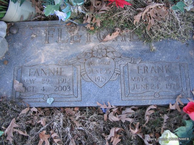SSW: Fannie - Inscription: "Married June 25, 1929" - Research Note: Married Fannie Ruth Taylor, June 25, 1929, Barry Co., MO. He was a son of Luellen and Frances T. (Cargile) Fletcher. - Another Photo | Headstone Mary Homesley Family Files Lonnie Stinecipher Photo Phyllis Long |