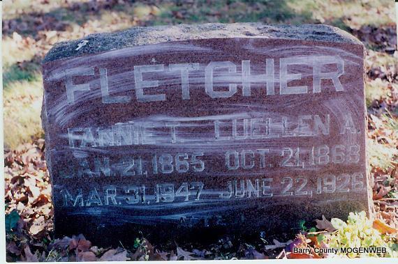SSW: Fannie T. - Research Note: Luellen Anthony Fletcher was the husband of Frances Tennessee Cargile and a son of William H. Fletcher and Adeline E. Johnson. - September 30, 1905, Cassville Democrat - Rock Springs News Items: L. A. Fletcher finished threshing the 25th and will soon commence hauling clover. - Fletcher Family History | Headstone Mary Homesley Family Files Death Certificate Online Newspapers Photo Phyllis Long |