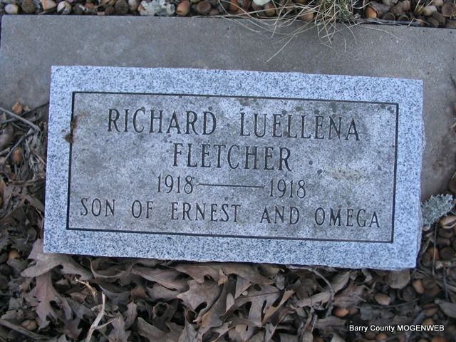 | FLETCHER, Richard Luellen | 1918 | 1918 | Inscription: "Son of Ernest and Omega" - Research Note: He was a son of Ernest Leroy and Alpha Omega "Meegie" (Morgan) Fletcher. | Headstone Mary Homesley Family Files Photo Phyllis Long |