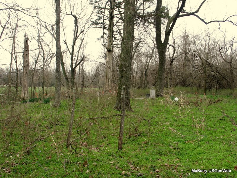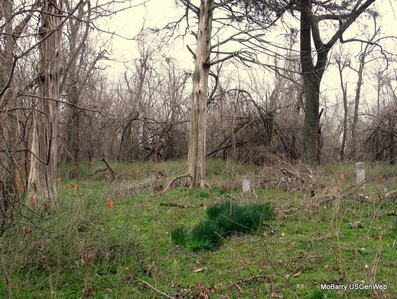 Amos remarried and he and his wife moved to Newton County near Racine. The farm was sold to the Ernest Wallen family. Their are several graves of members of the Wallen family who died between 1870 and 1990, five of these graves have stones that are engraved with their names. One I specifically remember is Bernice Wallen. Another grave, which has an engraved stone, is that of an employee of the Long family who died in 1993. There were also three slabs markers that were about 6 X 12 X 2. These had been laid against a tree and had no inscriptions. Bernice Wallen (who owned the farm at one time) had said that there were about 20 Civil War soldiers (both Union and Confederate) buried in the cemetery, so those slabs are probably some of their stones.