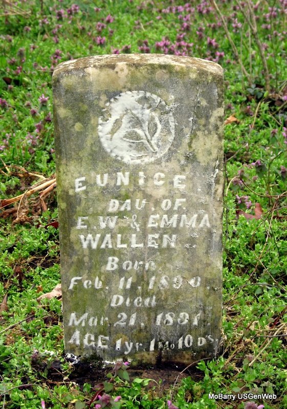 | WALLEN, Eunice | Feb. 11, 1890 | Mar. 21, 1891 | Inscription: "Dau. of E. W. and Emma Wallen - Aged 1 Yr. 1 Mo. 10 Ds." - Research Note: Daughter of Ernest William Wallen, born England, and Sarah Emma Meador, born MO. | Note Phyllis Long Photo Jack Fly Jay Trace |