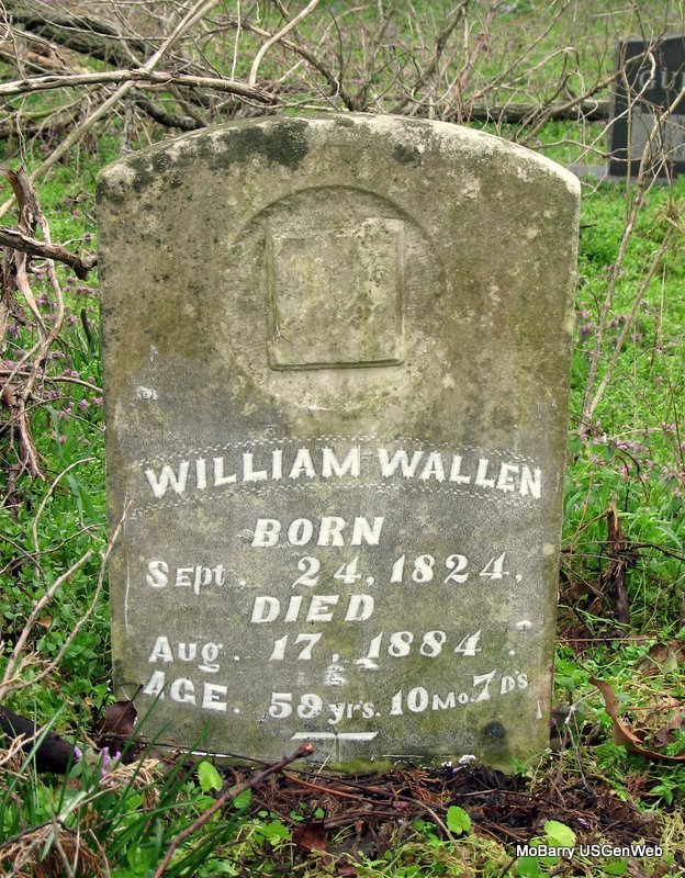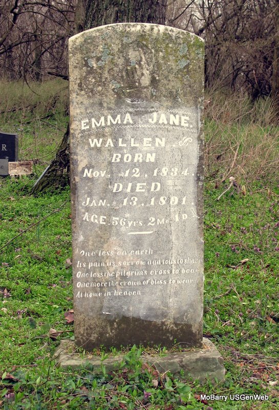 SSW: William - Inscription: "Age 56 Yrs. 2 Mo. 1 D." - Research Note: the double stone for her and William has Wallen spelled Wallin. - 1880 Census, Kings Prairie, Barry, Missouri - William Wallen, age 55, farmer, born Leichester, England; Emma J., wife, age 45, born Derby, England; Allis G., age 20, born Leichester, England; Earnest W., son, age 14, born Leichester, England; William R. Wright, nephew, age 12, born MO, father born Leichester, England, mother Derby, England. - Another Stone - Another Photo | Photos Jack Fly Jay Trace |
