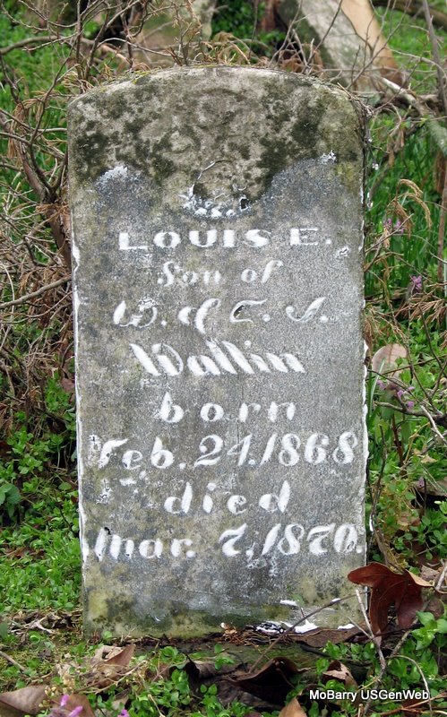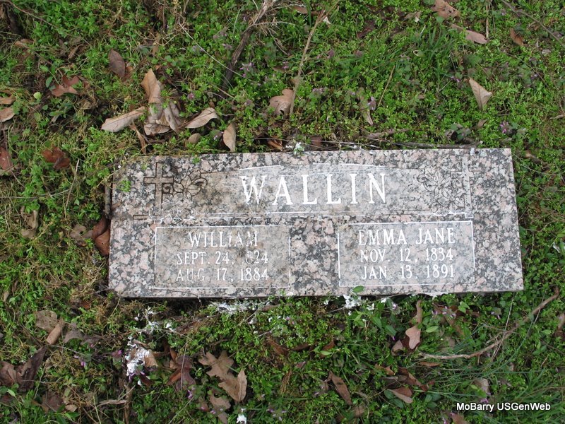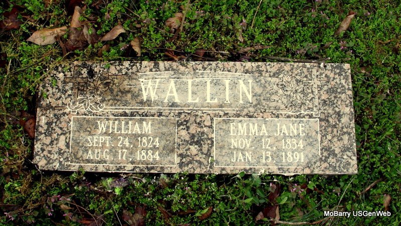 SSW: Emma Jane - Inscription: "Age 59 Yrs. 20 Mos. 7 D's." - Research Note: one stone has Wallin and one has Wallen. - 1880 Census, Kings Prairie, Barry, Missouri - William Wallen, age 55, farmer, born Leichester, England; Emma J., wife, age 45, born Derby, England; Allis G., age 20, born Leichester, England; Earnest W., son, age 14, born Leichester, England; William R. Wright, nephew, age 12, born MO, father born Leichester, England, mother Derby, England. - Another Stone - Another Photo | Census Phyllis Long Photos Jack Fly Jay Trace |