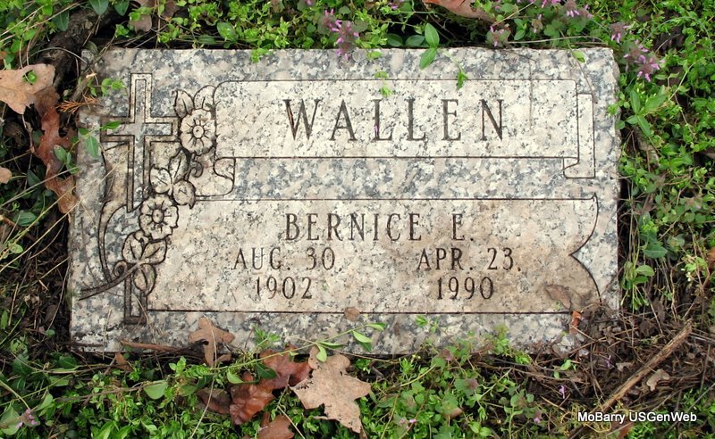 | WALLEN, Bernice Emma | Aug. 30, 1902 | Apr. 23, 1990 | Research Note: Daughter of Ernest William Wallen, born England, and Sarah Emma Meador, born MO. | Census Phyllis Long Photo Jack Fly Jay Trace |