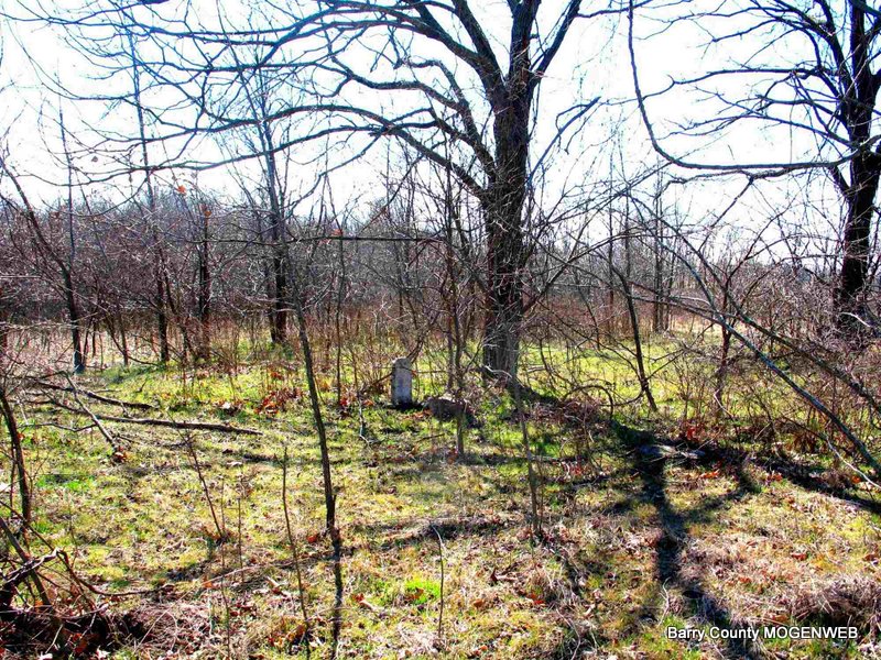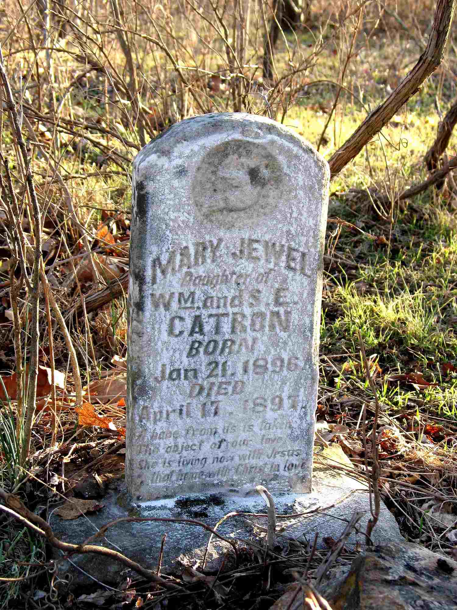 Inscription: "A babe from us is taken the object of our love. She is living now with Jesus, that home with Christ in love." - Research Note: Mary Jewell was the child of William and Sarah Eliza (Dibble) Catron. Her parents were married in Cassville August 24, 1884. William and Sarah Catron are buried in the Maplewood Cemetery. - The grave of Mary Jewell Catron is located north of Exeter across the road from the Old Sanders place. A special thanks to Steven Mattingly for bringing this grave to our attention. | Note Photo Jack Fly |