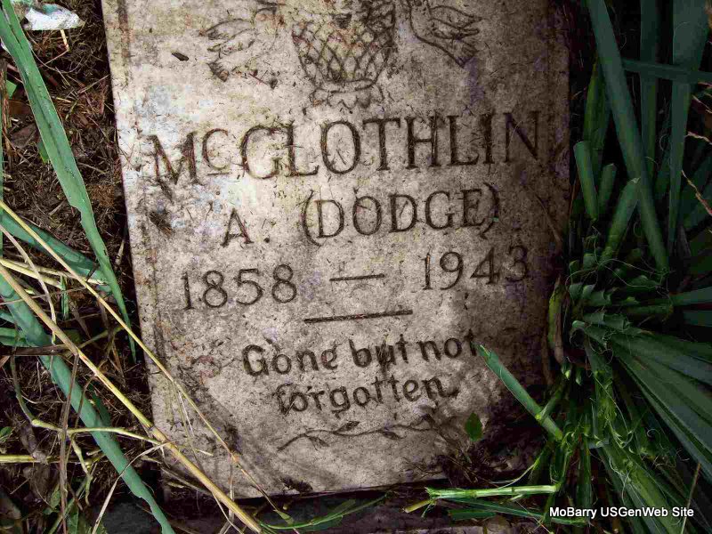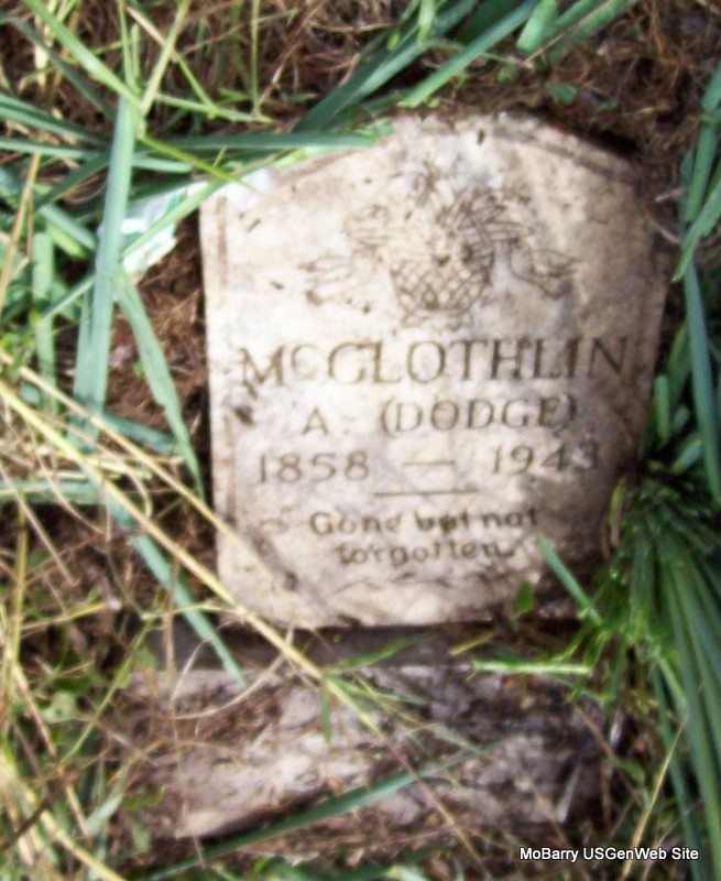 | MCGLOTHLIN, Andrew "DODGE" | May 16, 1858 | Feb. 2, 1943 | Inscription: "Gone But Not Forgotten" - Research Note: Stone is broken and on the ground. He was the son of Isaac Bell McGlothlin and his second wife, Tabitha Howell. After Isaac died, Tabitha married Cyrus Davidson (son of Levi Davidson of Perry Co., TN - mother unknown) Isaac's first wife was Sarah Brattin. - Andrew McGlothlin was born near Wheaton, Mo., May 16, 1858. He departed this life Feb. 2, 1943 at the age of 84 years, 8 months and 10 days. He suffered two strokes last week and remained in an unconscious condition to death. He was united in marriage to Caroline Woods Dec. 5, 1880. To this union four children were born, three boys and one girl. His wife and two children preceded him in death. In 1923 he was united in marriage to Nancy (Stroud) Matlock, who also preceded him in death. "Uncle Dodge" as he was known to everyone, had lived his entire life on the farm where he was born. His son, Arthur, had lived with him for some time and cared for him in his later years. He is survived by two sons, Arthur, of the home, and Fred, of Kansas City, Mo., three grandchildren and one great grandchild; one brother, Marion McGlothlin, of Exeter, Mo., and one half brother, Noah Davidson, of Fairview, Mo. One brother, two half brothers and two half sisters preceded him in death. - Another Photo - Brattin - Letters of Adm. | Obit Ruth Kent Online Obit Photos Darla Marbut |
