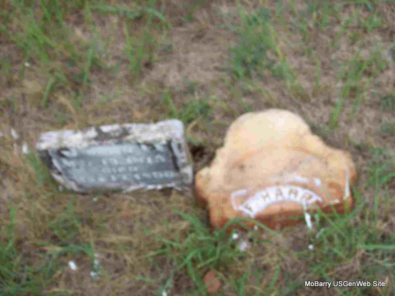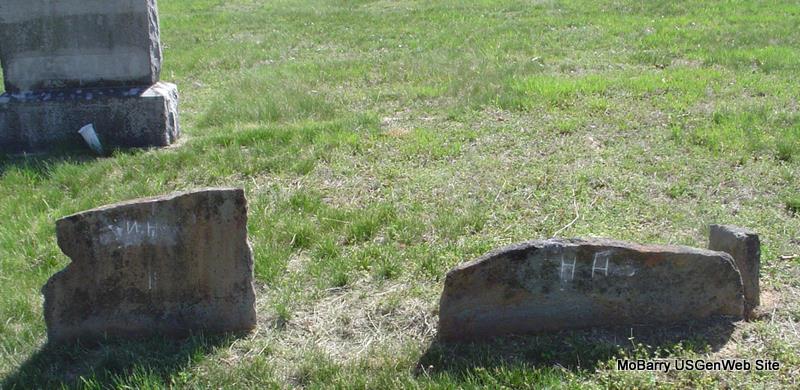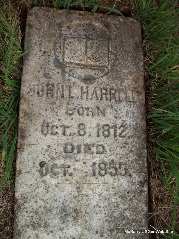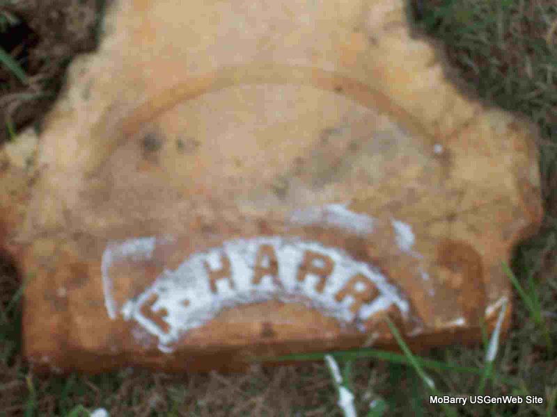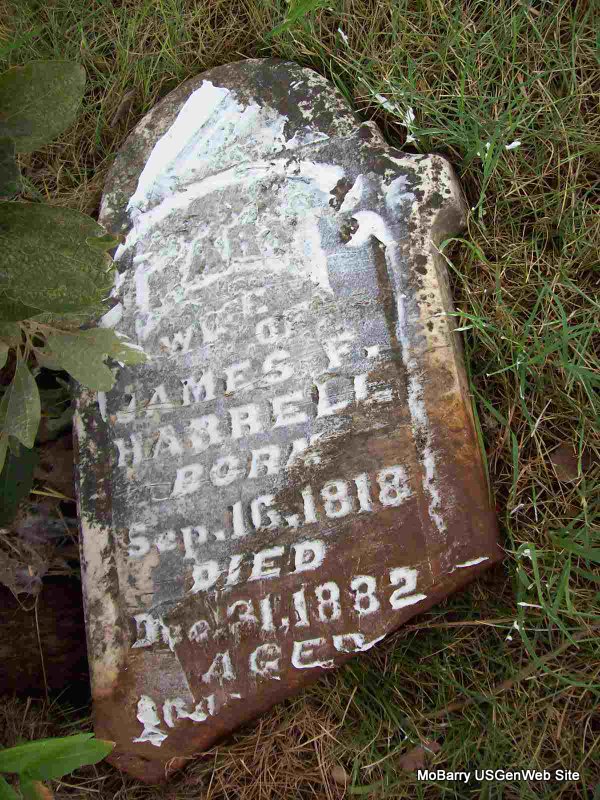 | HARRELL, F. | Mar. 13, 1815 | Mar. 17, 1890 | Research Note: Probably James Fowler Harrell. Husband of Mary Ann Chitwood. Son of James F. Harrell and Abigail "Abi" Moore. Stone is broken and on the ground. - 1850 Census, District 5, Barry, Missouri - James F. Harrell, age 35, born TN; Mary Harrell, age 32, TN; John W., age 12, born TN; Jesse, age 11, born MO; Susan, age 7, born MO; William A., age 5, born MO. - Pieces of Stone - Date Part - Pieces | Note Census Phyllis Long Photos Darla Marbut |