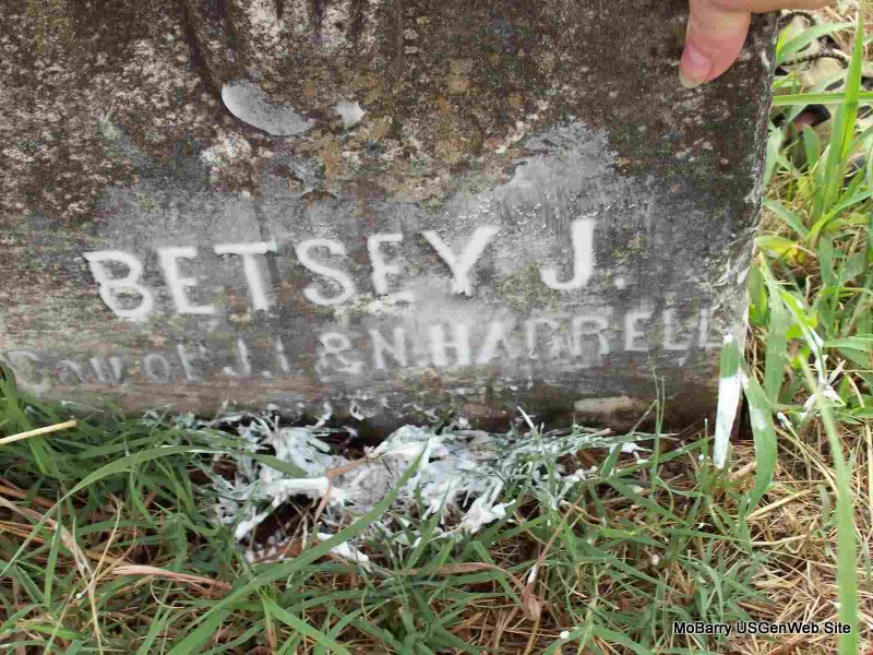 | HARRELL, Betsey J. | Feb. 6, 1842 | Dec. 1858 | Inscription: "Dau. of J. L. and N." - Research Note: Stone is broken and is buried part way down in the ground. Daughter of John L. Harrell and Nicy Chitwood. | Census Phyllis Long Photo Darla Marbut |