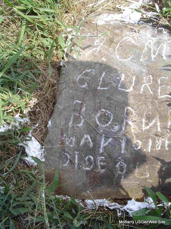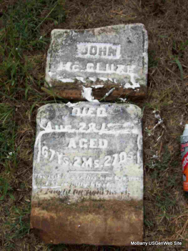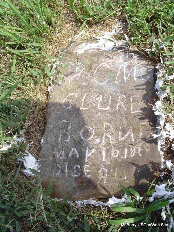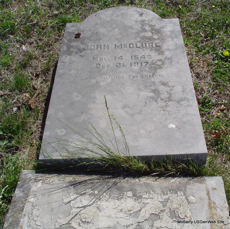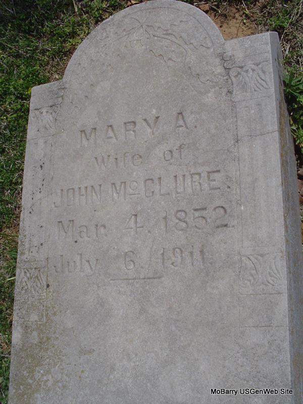 Research Note: The stone is off its base and is on the ground. His death certificate gives his birth date as Dec. 21, 1842. His mother's maiden name was Harrell and his father was James (John) MCClure. He was a widower, born in TN. Sam McClure of Rocky Comfort, MO was the informant on the death certificate. - Other researchers say he was the son of John McClure (I agree) and Susan Harrell. 1880 Census, Liberty, Barry, Missouri - Living 2 doors down from James and Lucy McClure. John McClure, age 37, born TN, father born SC, mother TN; Mary A., wife, age 28, born MO, parents born MO. - 1910 Census, Liberty, Barry, Missouri - John McClure, head, age 66, married once 30 years, born TN, father born SC, mother TN; Mary A., wife, age 57, married once 30 years, no children, born MO, parents born TN. - January 17, 1918, Cassville Republican - Sam McClure of near Exeter has been appointed by Judge Landis as the administrator of the estate of John McClure, dec'd, an uncle, who died a few weeks ago at his home in that locality. | Census Online Newspapers Phyllis Long Death Certificate Photo Donna Cooper |