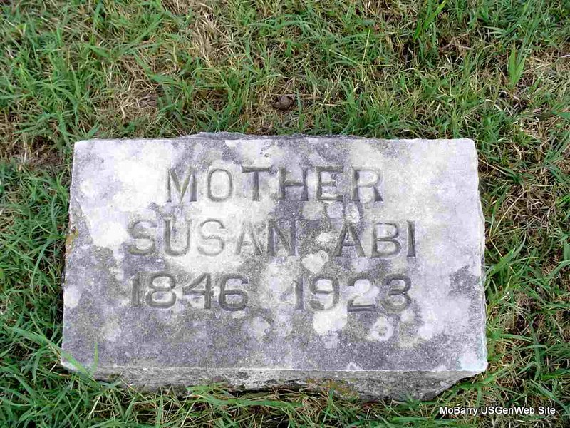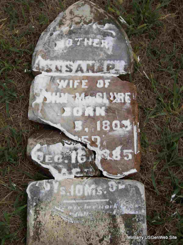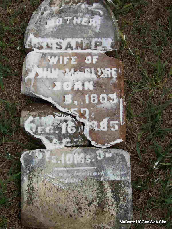 Aug. 28, 1871 | Inscription: "Age 67 Ys 2 Ms 27 Ds" - Research Note: Stone is broken and on the ground. - 1850 Census, District 5, Barry, Missouri - John McClure, age 45, born SC; Susan, age 39, born GA; George, age 18, born TN; Martha, age 17, born TN; Elizabeth, age 14, born TN; William, age 11, born TN; Thomas, age 8, born MO; Samuel, age 2, born MO. - 1860 Census, Liberty, Barry, Missouri - John McClure, age 53, born SC; Susan, age 57, born GA; Martha, age 26, born TN; Hany (William?), age 21, born TN; Thomas J. (John), age 17, born TN; Samuel, age 12, born TN; Mary, age 9, born MO; Mary A. Harrell, age 6, born MO. - 1870 Census, Shoal Creek, Barry, Missouri - John McClure, age 63, born SC; Susan, age 62, born GA; Mary, age 19, born MO; Martha, age 37, born TN; Mary A. Harrell, age 16, born MO. | Census Phyllis Long Photo Darla Marbut |