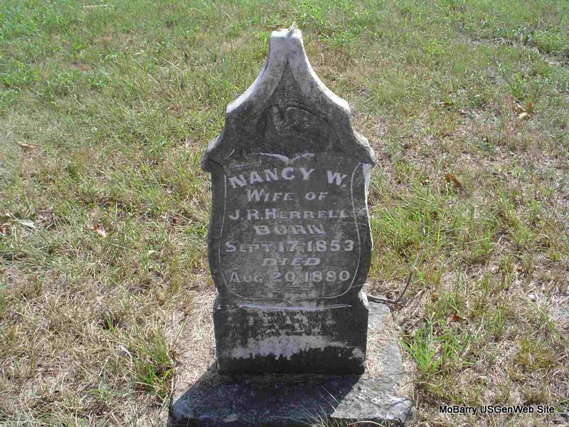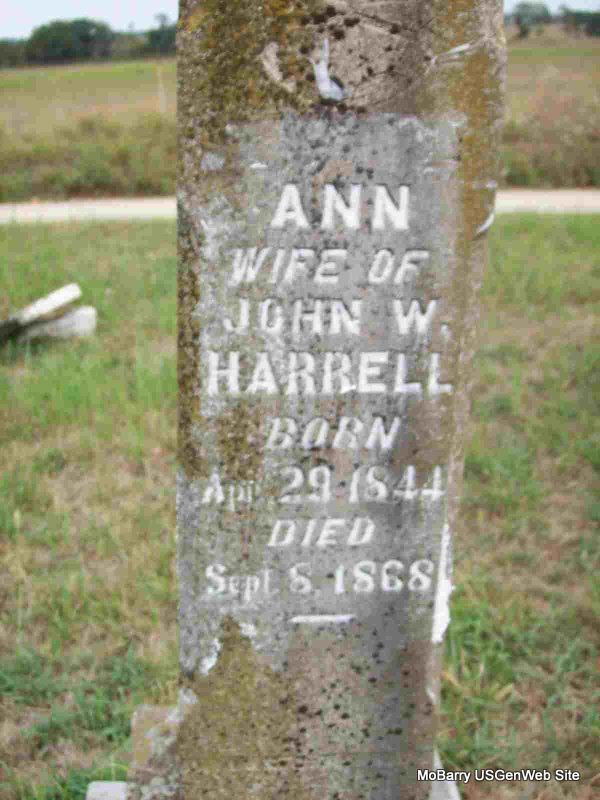 | HARRELL, Ann (PACKWOOD) | Apr. 29, 1844 | Sept. 8, 1868 | Inscription: "Wife of John W. Harrell" - Research Note: Ann Packwood married John W. Harrell on Oct. 13, 1859 in Barry Co., MO. Daughter of John Ira Packwood and Abigail Tinder. | MO Marriage Records Census Phyllis Long Photo Darla Marbut |