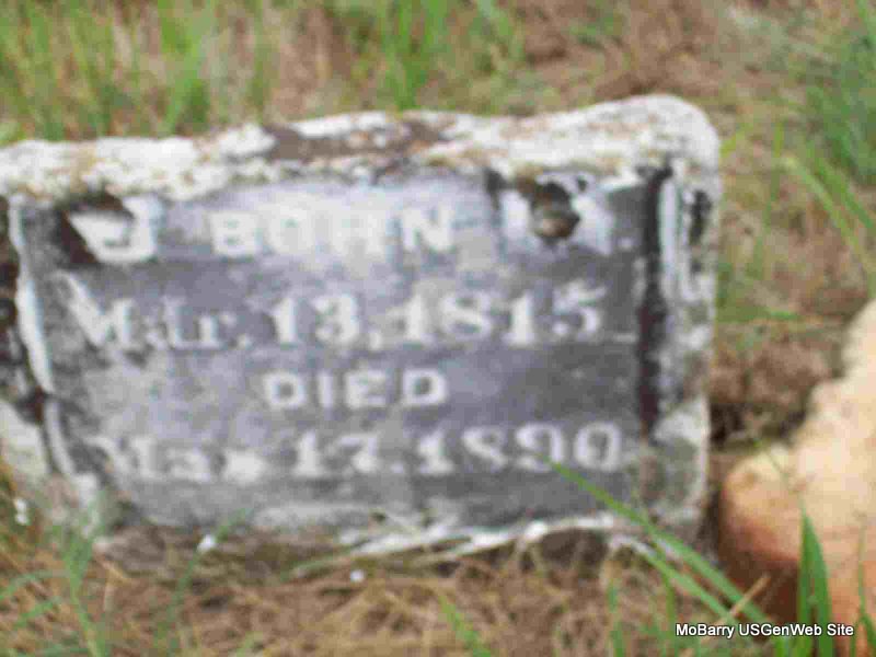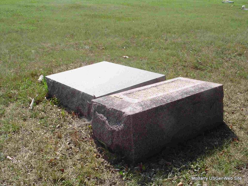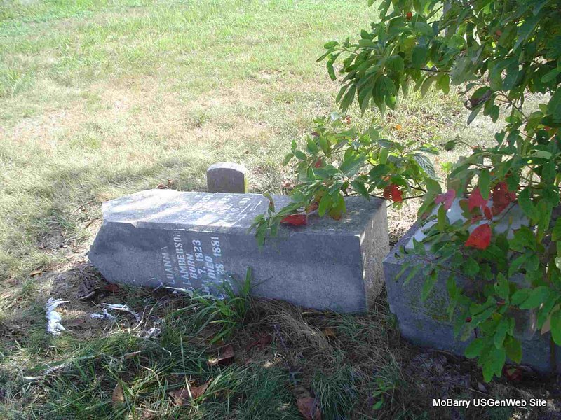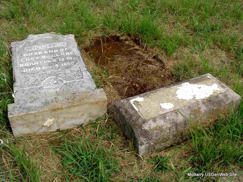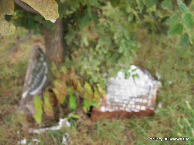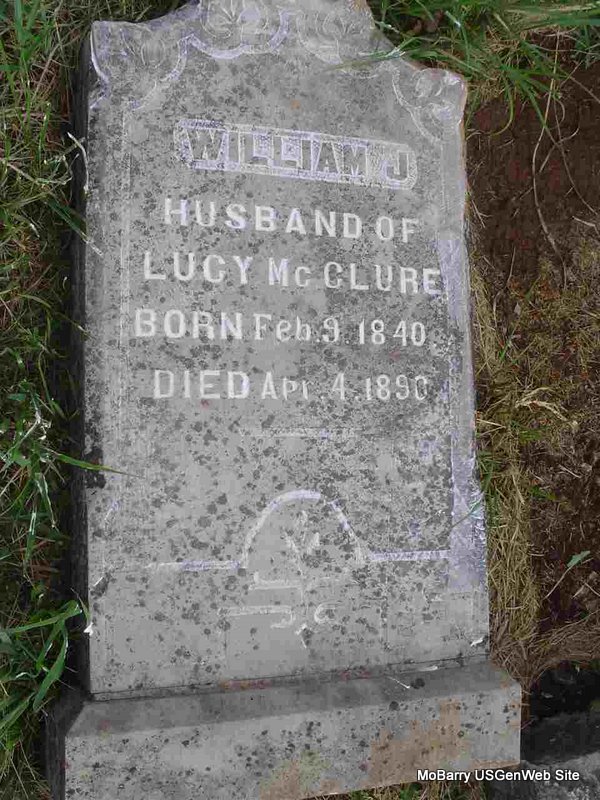 | MCCLURE, William J. | Feb. 9, 1840 | Apr. 4, 1890 | Inscription: "Husband of Lucy McClure" - Research Note: Stone is off its base and on the ground. Either the son of John McClure and Susan Harrell or James C. and Lucy McClure. See census. William J. McClure's wife was Lucy Davidson, daughter of Levi and Sarah (Lamberson) Davidson. - 1850 Census, District 5, Barry, Missouri - John McClure, age 45, born SC; Susan, age 39, born GA; George, age 18, born TN; Martha, age 17, born TN; Elizabeth, age 14, born TN; William, age 11, born TN; Thomas, age 8, born MO; Samuel, age 2, born MO. - 1850 Census, Benton, Newton, Missouri - James McClure, age 40, born SC; Lucy, age 33, born TN; Samuel, age 16, born TN; Franklin, age 11, born TN; William, age 9, born TN; Mary, age 8, born TN; John, age 7, born TN; Nancy, age 5, born TN; Nicey, age 2, born TN. - Another View | Note Ruth Kent Photo Donna Cooper |