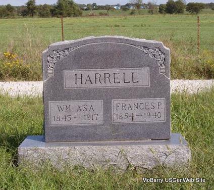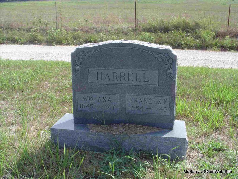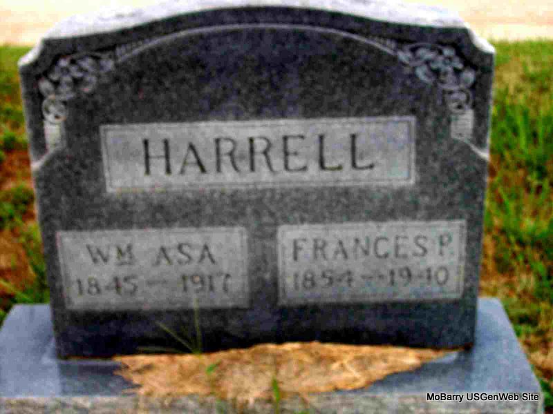 | HARRELL, William Asa | 1845 | Apr. 2, 1917 | SSW: Frances P. Harrell - Research Note: His wife was Frances Priscilla Patton. Son of James Fowler Harrell and Mary Ann Chitwood. - April 14, 1917, Saturday, Cassville Democrat - Acea Harrell Dead: Another splendid man and citizen of Barry County has passed to eternity, clothed with the high esteem and confidence of everybody, who had the pleasure of his acquaintance. Acea Harrell died Monday, April 2, of pneumonia, age 71 years, leaving his family to mourn his passing. He was a son of the late Mr. and Mrs. James Harrell early, well known and highly esteemed citizens of the western part of this county. The remains were interred April 5, in Chitwood cemetery. - Another Photo - Another Photo | Census Online Newspapers Phyllis Long Headstone Betty Lamberson Photo Donna Cooper Photos Darla Marbut |