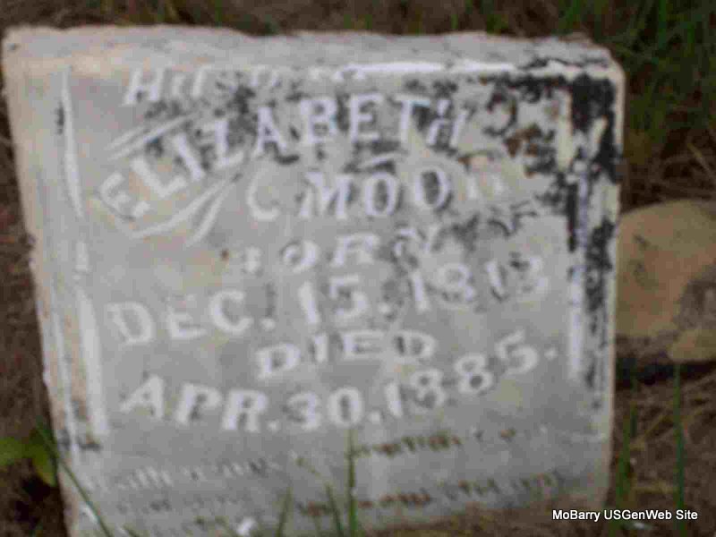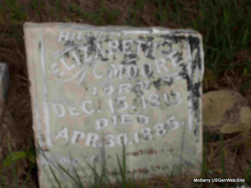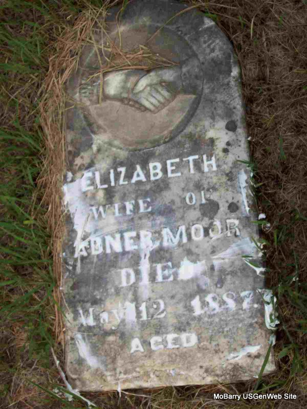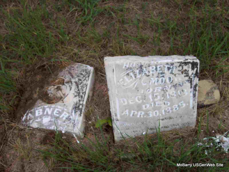 Inscription: "Husband of Elizabeth" - Research Note: Stone is broken and on the ground. Probably the son of Abner Moor and Mary Ann Mayes. - Bottom of stone - Top of Stone - Piece of Stone | Census Phyllis Long Photos Darla Marbut |