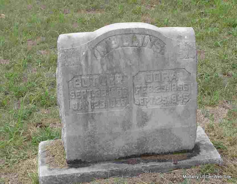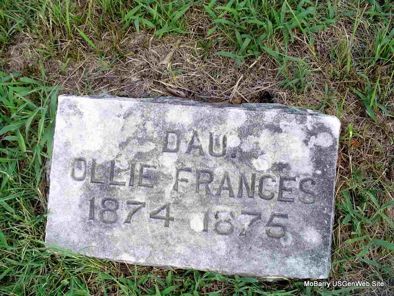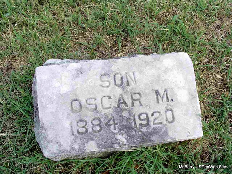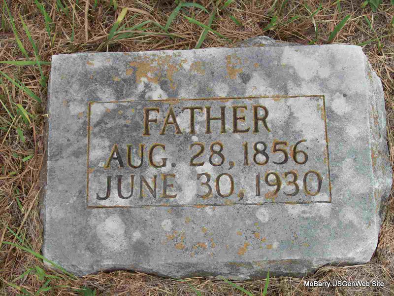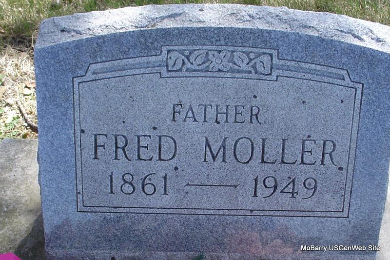 Inscription: "Father" - Research Note: His wife was Stella Mollar of Rocky Comfort, MO and she was the informant on the death certificate. Indexed as Moller. Son of Augusta Mollar. Mother's maiden name not known. Usual residence was 2 miles South of Rocky Comfort, MO. - 1900 Census, Richwood, McDonald, Missouri - Fred Moller, head, born Oct. 1861 Germany, age 38, single, parents born Germany, immigrated to U.S. in 1885. - Still single in the 1910 Census. - 1920 Census, Richwood, McDonald, Missouri - Fred Moller, head, age 58, born Holstein, Germany, parents born Holstein, Germany; Stella, wife, age 24, born MO, parents born TN; Gladys, daughter, age 8, born MO. - 1930 census, Gladys is not with them, but have Ray, age 15, son, Irene, age 5, daughter, and Archie, age 2, son. 1940 Census, Ray is gone, but still have Doris Irene, age 14, and Archie, age 11. | Death Certificate Census Phyllis Long Photo Donna Cooper |