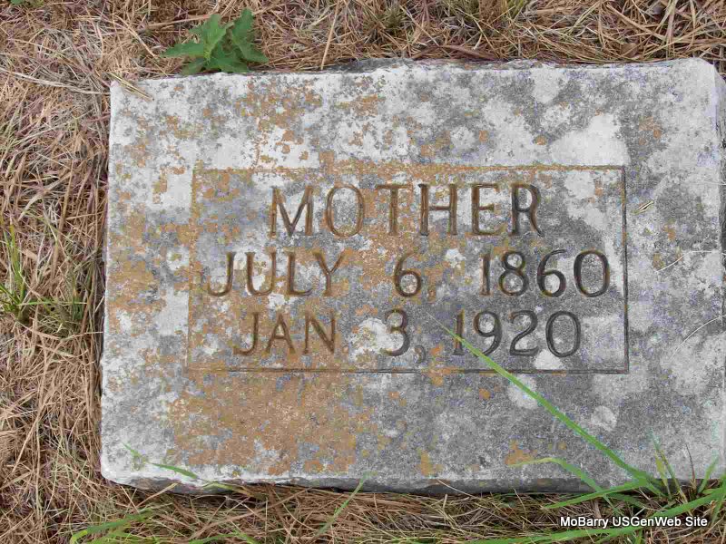 | MCCLURE, Mary A. | Mar. 4, 1852 | July 6, 1911 | Inscription: "Wife of John McClure" - Research Note: The stone is off it base and laying on the ground. Probably Mary A. Harrell in this census. - 1860 Census, Liberty, Barry, Missouri - John McClure, age 53, born SC; Susan, age 57, born GA; Martha, age 26, born TN; Hany (William?), age 21, born TN; Thomas J. (John), age 17, born TN; Samuel, age 12, born TN; Mary, age 9, born MO; Mary A. Harrell, age 6, born MO. - 1880 Census, Liberty, Barry, Missouri - John McClure, age 37, born TN, father born SC, mother TN; Mary A., wife, age 28, born MO, parents born MO. - 1910 Census, Liberty, Barry, Missouri - John McClure, head, age 66, married once 30 years, born TN, father born SC, mother TN; Mary A., wife, age 57, married once 30 years, no children, born MO, parents born TN. | Census Phyllis Long Photo Donna Cooper |