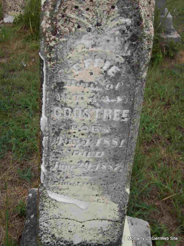 | GOOSTREE, Effie | July 1, 1881 | June 29, 1887 | Inscription: "Dau. of W. T. and D. E." - Research Note: Daughter of William T. Goostree and Dicy E. Duncan. | Note Phyllis Long Photo Darla Marbut |