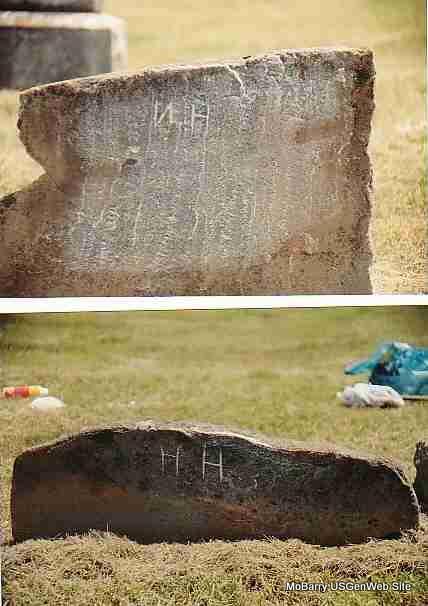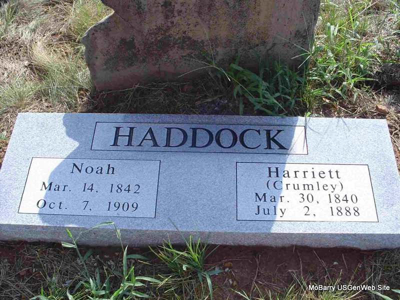 Research Note: Stone is a sandstone with N. H. craved on it. Noah has no dates on his stone and his grave is next to his wife's, Harriett Crumley. Noah served as a Confederate soldier in the Civil War and was at the Pea Ridge Battle. He was a son of Charles Haddock, Jr. and his wife Sarah Collins. He was my great grandfather. - New Stone | Family Files Photos Donna Cooper |