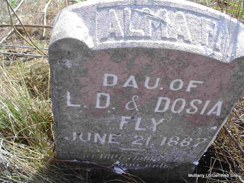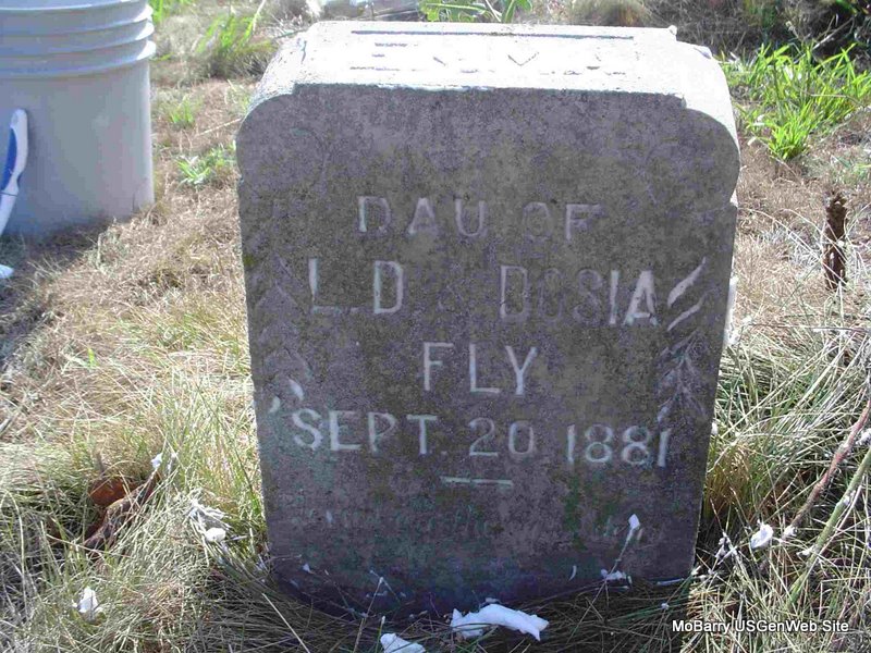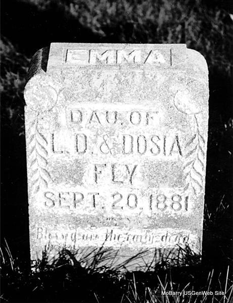 | FLY, Emma | Sept. 20, 1881 | Sept. 20, 1881 | Inscription: "Emma - Dau. of L. D. and Dosia Fly" - Research Note: Daughter of Lorenzo Dow and Theodosia (Sneed) Fly. - Another Photo | Note Phyllis Long Photo Nancy Wickam Photo Donna Cooper |