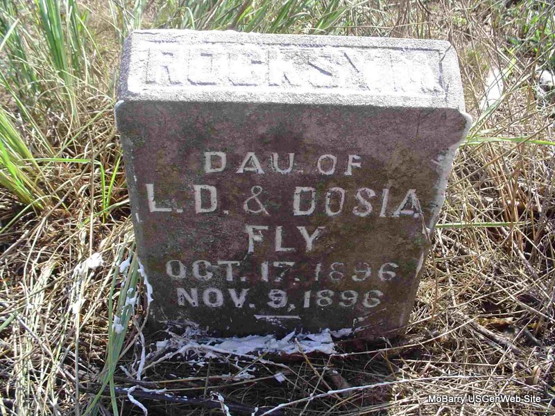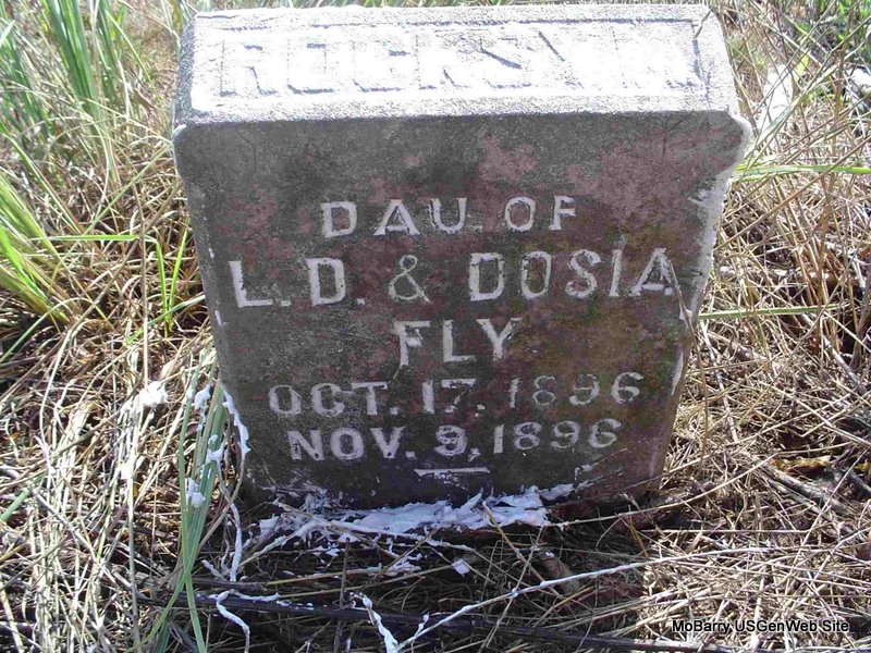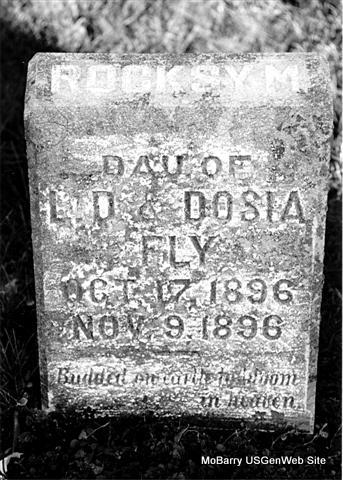| FLY, Rocksy M. | Oct. 17, 1896 | Nov. 9, 1896 | Inscription: "Rocksy M. - Dau. of L. D. and Dosia Fly" - "Budded on earth to bloom in Heaven" - Research Note: Daughter of Lorenzo Dow and Theodosia (Sneed) Fly. - Another Photo - Another Photo | Note Phyllis Long Photos Nancy Wickam Photo Donna Cooper |