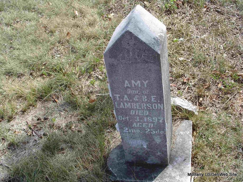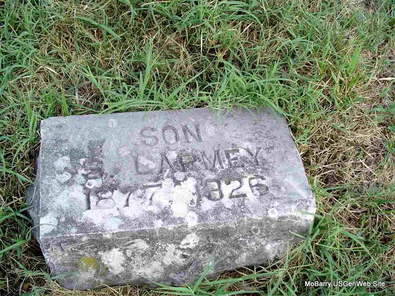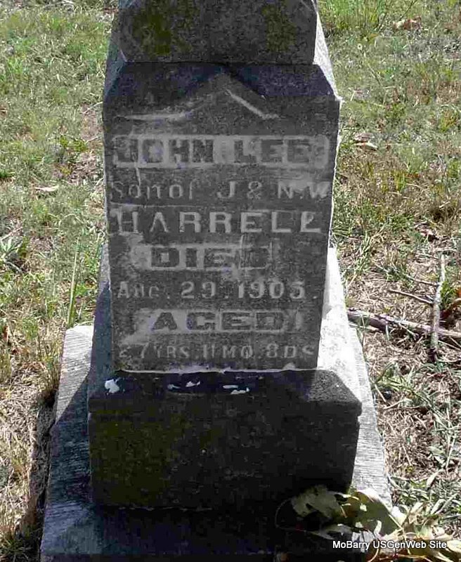 | HARRELL, John Lee | Abt. 1877 | Aug. 29, 1905 | Inscription: "Son of J. and N. W. - Aged 27 Yrs 11 Mo 8 Ds" - Research Note: Son of Joseph P. Harrell and Nancy Lamberson. John Lee is named in his father's obit. - September 9, 1905, Cassville Democrat - John Lee Harrell, age 27, 11 months and 8 days, died Aug 29 from typhoid fever, at his home three miles northwest of this place. He was a good citizen. Rev. J. Turner Horner conducted the funeral services. | Online Obit Photo Donna Cooper |