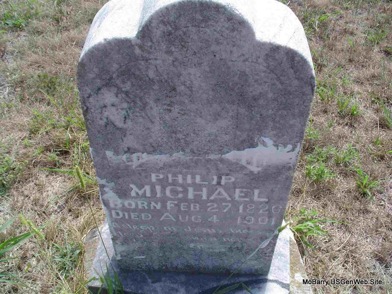 Research Note: His wife was Manerva Caroline Baskins. Son of Phillip and Rebecca Michael. - 1850 Census, District 53, McDonald, Missouri - Phillip Michael, age 25, born AR; Caroline age 21, born TN; John Calhoun, age 1, born MO. - Living 2 doors away from his father Phillip Michael, age 58, born PA and mother Rebecca, age 55, born NY. - 1870 Census, Sugar Creek, Barry, Missouri - P. Michael Jr., age ??, born AR; Caroline, age 41, born TN; Rebecca, age 20, born AR; Nancy, age 16, born AR; Robert, age 14, born AR; Sarah, age 11, born AR; Marissa or Missouri (probably Missouri), age 8, born MO. - Phillip and Caroline had children, John Calhoun, Rebecca Louisa, Nancy Evelyn, Robert, Sarah Jane, Marissa, and Missouri Alice. | Census Phyllis Long Photo Donna Cooper |