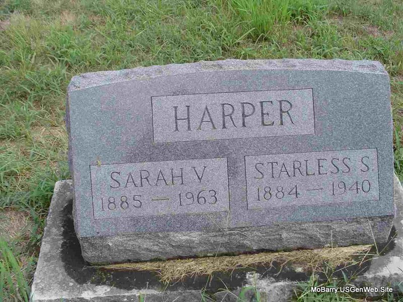 SSW: Sarah V. - Research Note: He died in the office of Dr. G. W. Salyer. His wife was Sarah Duncan, age 55 when Starless died. Son of Isaac Harper and Mary Ann Parkison/Parkerson. His wife was the informant on the death certificate. - 1940 Census, Liberty, Barry, Missouri, Street: Woodward Creek, Private Road - Starless S. Harper, head, age 55, born IN, farmer; Sarah, wife, age 54, born MO; Mary, mother, widowed, age 80, born IN; Nancy C. Duncan, mother-in-law, widowed, age 85, born TX. | Death Certificate Census Phyllis Long Photo Donna Cooper |