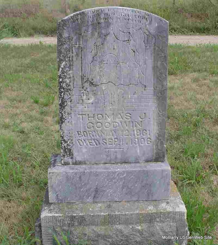 | GOODWIN, Thomas Jefferson | May 12, 1861 | Sept. 1, 1906 | Research Note: Son of Thomas M. Goodwin and Mahala Dobbs. Thomas J. Goodwin, of Exeter, MO, first married Matilda Keeling, of Butterfield, MO, on Sept. 8, 1887 in Barry Co., MO. Mary A. Keeling, mother of Matilda, gave consent to the marriage. Thomas J. Goodwin, age 38, second married Rachel Lee, age 20, on Apr. 29, 1900 in Exeter, Barry Co., MO. | Census MO Marriage Records Phyllis Long Photo Donna Cooper |