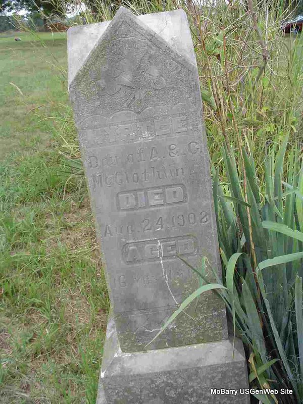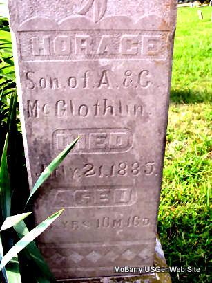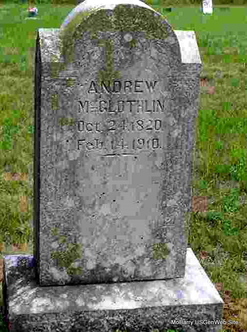 | MCGLOTHLIN, Andrew | Oct. 21, 1820 | Feb. 14, 1910 | Research Note: The older Andrew McGlothlin (1820-1910) was a brother of Isaac Bell McGlothlin and never married. - Cassville Republican , Feb. 24, 1910 - Andrew McGlothlin died at the home of his nephew, A. McGlothlin, near Wheaton Feb. 14, age 89 years. He came to Barry county with the family of Nathaniel Meador from Summer county, Tennessee in 1847 and settled on the Washburn prairie, and has been a citizen of the county since that time except a short time spent in California. McGlothlin was a highly respected citizen but on account of his secluded habits was not widely known in the county. He leaves no family. | Online Newspapers Phyllis Long Note Ruth Kent Photo Donna Cooper |