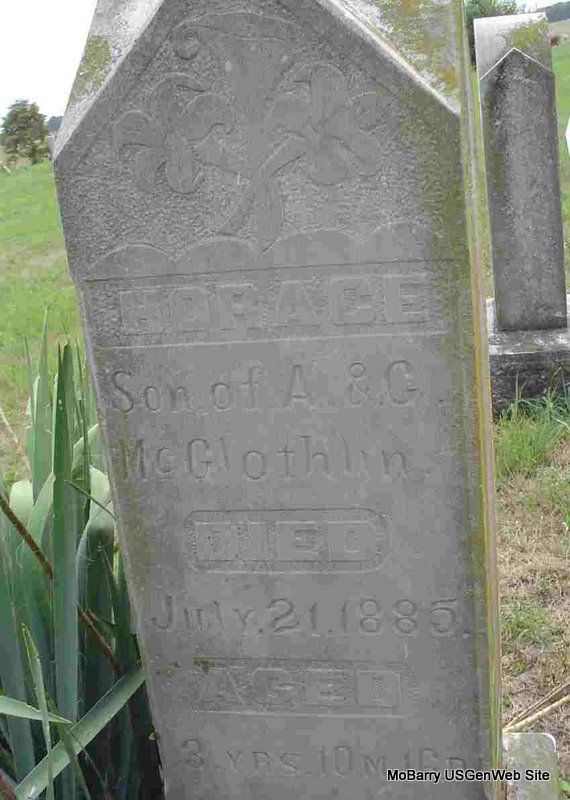 | MCGLOTHLIN, Horace | Abt. 1881 | July 21, 1885 | Inscription: "Son of A. and C. McGlothlin" - Research Note: Son of Andrew "Dodge" McGlothlin and Caroline Woods. - Another Photo | Note Phyllis Long Headstone Cheryl Photo Donna Cooper |