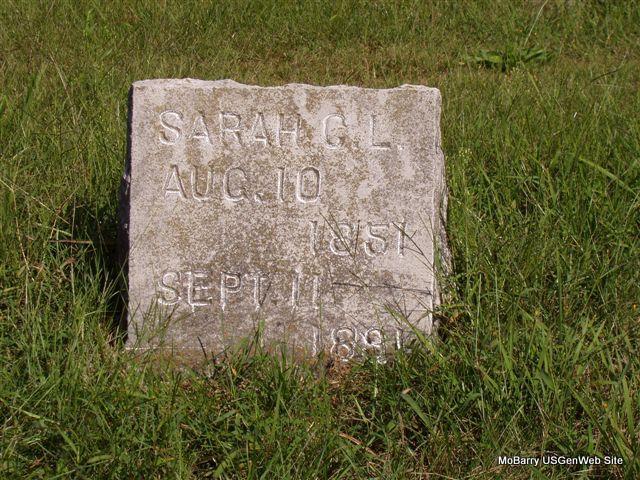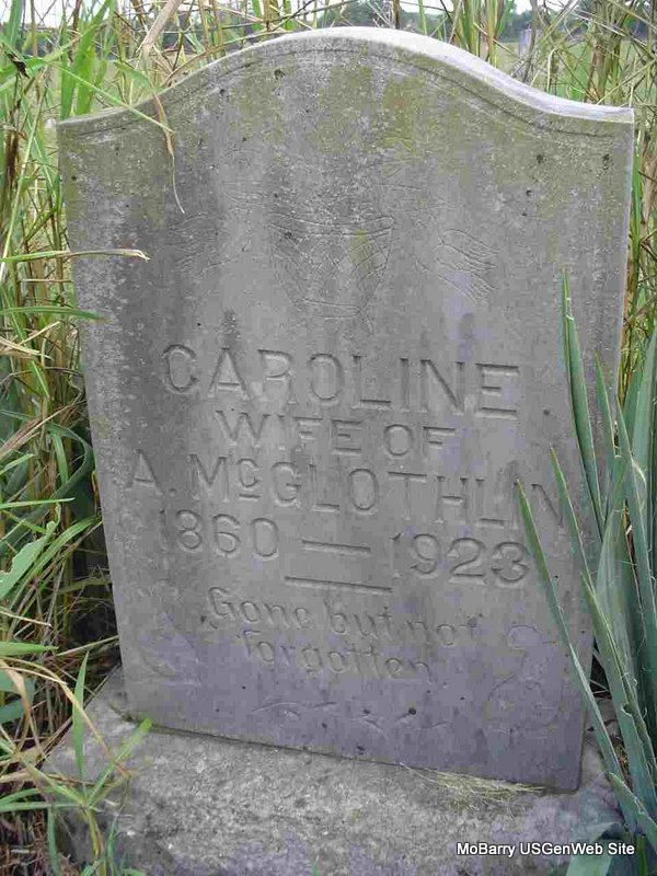 Inscription: "Wife of A. McGlothlin" - Research Note: Andrew McGlothlin was united in marriage to Caroline Woods Dec. 5, 1880. - Wheaton Journal, Friday, June 1, 1923 - Mrs. Carolina McGlothlin, wife of Andrew McGlothlin, died Wednesday, May 20, 1923 in her home south of town. Death came as a welcome relief from the suffering she has endured for the past two years caused by paralysis. Carolina Woods was born May 10, 1860 in Illinois, moving to Texas at an early age and living with a sister after the death of her parents. At about the age of 18 she moved to Rolla, Mo., and on Dec. 5, 1880 was married to Andrew McGlothlin. To this union were born four children: Horace, Arthur, Myrtle and Fred. Horace died at the age of three and Myrtle at the age of sixteen. Arthur and Fred are both living in and around Wheaton. She is survived by a sister, Mrs. Julia Morris of Joplin and a brother in Oklahoma. In 1882 she was converted at a meeting in Rocky Comfort and became a member of the Baptist Church at that place, later moving her membership to Wheaton when the Baptist church was organized there. She was buried in the Chitwood Cemetery south of here. Due to the late arrival of the hearse caused by motor trouble, the funeral was postponed and will be preached the second Sunday in June by Rev. E. C. Ticnenor at the Baptist Church. | Note Ruth Kent Obit Phyllis Long Photo Donna Cooper |