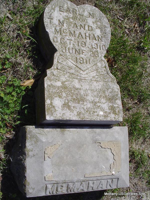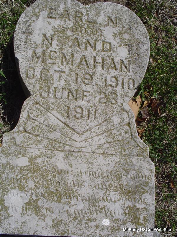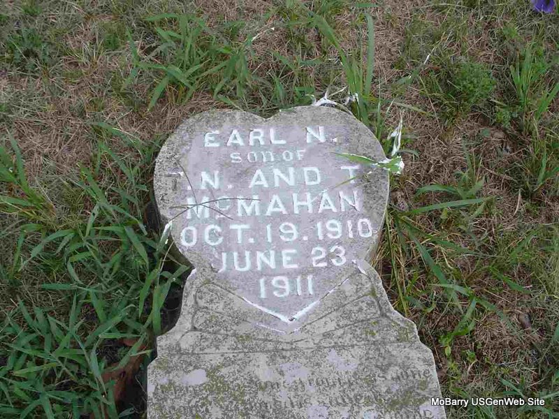 | MCMAHAN, Earl N. | Oct. 19, 1910 | June 23, 1911 | Inscription: "Son of T. N. and T. McMahan" - Research Note: Stone is off its base and is broken. - Another photo - Another Photo | Photos Donna Cooper |