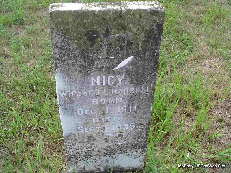 | HARRELL, Nicy (CHITWOOD) | Dec. 1, 1811 | Sept. 1855 | Inscription: "Wife of J. L. Harrell" - Research Note: She was married to John L. Harrell. Probably the daughter of Joel Chitwood and his first wife Sarah Short. | Note Photo Donna Cooper |