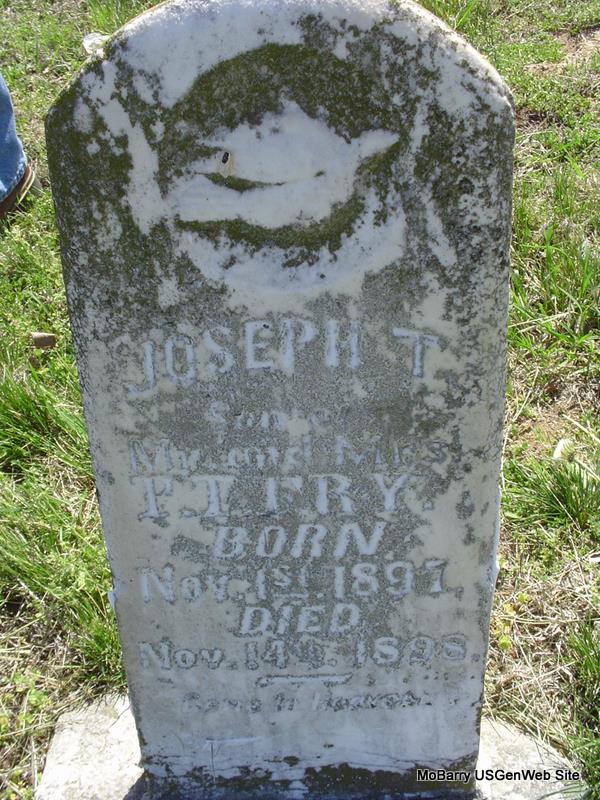 | FRY, Joseph T. | Nov. 1, 1897 | Nov. 14, 1898 | Inscription: "Son of Mr. and Mrs. P. T. Fry - Born Nov. 1st, 1897 - Died Nov. 14th, 1898" | Photo Donna Cooper |