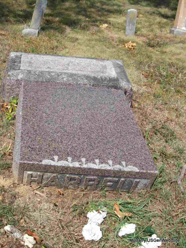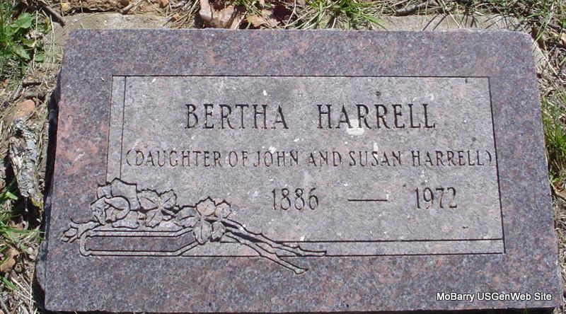 SSW: Susan B. - Research Note: He was widowed twice and his wife at the time of death was given Susan Harrell. His first wife was Adeline Weatherly. 1862 was given as the birth year on the death certificate. Son of John W. Harrell and Ann Packwood. Bertha Graves of Wheaton, MO was the informant on the death certificate. | Note Death Certificate Phyllis Long Photo Donna Cooper |