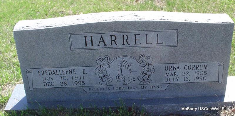 | HARRELL, Orba Corrum | Mar. 22, 1905 | July 13, 1990 | SSW: Fredalleene - Research Note: Son of John James Harrell and Adeline Weatherly. - 1940 Census, Union, Humboldt, California - Ray Garrett, head, age 40, born AR, service station attendant; Lois Garrett, wife, age 44, born MO; Orba Harrell, lodger, widowed, age 35, born MO, laborer at lumber mill. | Census Phyllis Long Photo Donna Cooper |