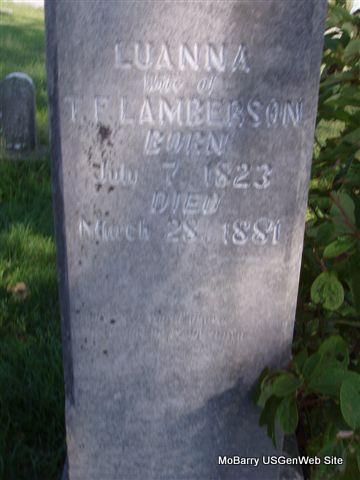 Aft. 1880 | Research Note: Stone is on the ground and off it's base - and was nearly buried. It is a home-made one and I am not sure what the last line reads. James McClure born 1810 in SC married Lucy W. born 1816 in TN. No date given. - 1850 Census, Benton, Newton, Missouri - James McClure, age 40, born SC; Lucy, age 33, born TN; Samuel, age 16, born TN; Franklin, age 11, born TN; William, age 9, born TN; Mary, age 8, born TN; John, age 7, born TN; Nancy, age 5, born TN; Nicey, age 2, born TN. - 1860 Census, Liberty, Barry, Missouri - James, C. McClure, age 50, born SC; L. W., age 42, born TN; M. F.?, female, age 19, born TN; John, age 18, born TN; Nancy, age 16, born TN; Nicy, age 11, born TN; Sarah, age 8, born MO; E. T., age 3, female, born MO. - 1870 Census, Shoal Creek, Barry, Missouri - James McClure, age 61, born SC; Lucy, age 55, born TN; Mary, age 27, born TN; John, age 26, born TN; Nancy, age 25, born TN; Sarah, age 16, born MO; Betsy, age 14, born MO; James Harrell, age 22, born TN. - 1880 Census, Liberty, Barry, Missouri - James McClure, age 70, born SC, father born Ireland, mother SC; Lucy, age 66, wife, born TN, parents born GA; Mary, age 39, daughter, born TN; Nancy, daughter, age 35, born TN; Elizabeth, daughter, age 23, born MO. - There is a base for Another stone next to it. - Another Photo - Another Photo | U.S. Marriage Records Census Phyllis Long Note Photos Donna Cooper |