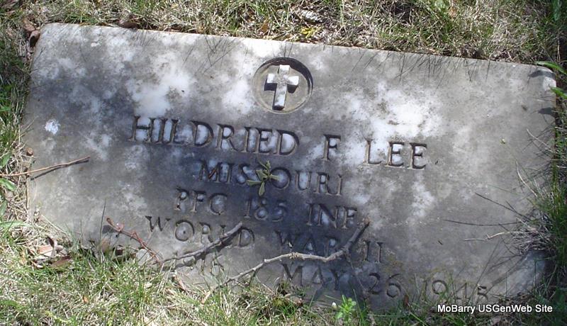 | LEE, Hildried F. | May 10, 1916 | May 26, 1945 | Inscription: "MISSOURI, PFC 185 INF - WORLD WAR II" - Research Note: Son of Walter Clay Lee and Eldie J. Woods. KIA WWII. | Census WWII Records Phyllis Long Photo Donna Cooper |