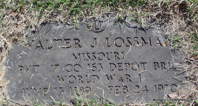 | LOSSMAN, Walter Joseph | June 13, 1889 | Feb. 24, 1970 | SSW: Shirley Mae - Inscription: "Father and Grandfather" - Research Note: Son of Adolph Carl Lossman and Elvina Manske, both born Germany. He first married Cecile Meyers, second, Augusta "Tillie" Carson, and third, Shirley May Carlson, sister to Tillie. - Military Stone - Inscription: "MISSOURI PVT 17 CO 163 DEPOT BRIG - WORLD WAR I | Census Phyllis Long Photos Donna Cooper |