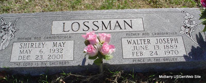 SSW: Walter Joseph - Inscription: "Mother and Grandmother" - Research Note: Her stone reads that she was born in 1932 and her obit reads that she was born in 1923. According to the age of 69, she was born in 1932 as the stone reads. Shirley Lossman, age 69, of Neosho, died Dec. 23, 2001, at Medicalodge in Neosho. She was born May 6, 1923, in Bristol, IL. She was a daughter of August and Christina (Jensen) Carlson. She had lived in the Rocky Comfort, Wheaton, Purdy areas since 1965 before moving to Medicalodge in Neosho a little over a year ago. She was a member of the First Baptist Church in Purdy. She married Walter J. Lossman on September 3, 1950, in Earlyville, Illinois, and he preceded her in death. | Monett Times Photo Donna Cooper |