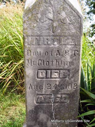 | MCGLOTHLIN, Myrtle | Sept. 1885 | Aug. 24, 1902 | Inscription: "Dau. of A. and C. McGlothlin - 16 Yrs, 11 Mos, 18 Days" - Research Note: Daughter of Andrew "Dodge" McGlothlin and Caroline Woods. - Myrtle married Ira Garrison. - Cassville Republican, Dec. 26, 1901 - Licensed to Wed: Ira Garrison, 22, Corsicana and Myrtle McGlothlin, 16, El Paso. - Dennis Howerton's Note: The first Mrs. Ira Garrison was Myrtle McGlothlin, born in September 1885, married on December 21, 1901, and dying in childbirth on August 24, 1902. According to my mother, Vera Garrison Howerton, daughter of Ira and second wife Mary Etta Vassar, the McGlothlins strongly disapproved of their daughter marrying Ira, and when she died they buried her as Myrtle McGlothlin instead of Garrison. She has a tombstone in Chitwood Cemetery but there is some belief that she is actually buried in Hogeye (Overton) Cemetery under the large McGlothlin stone. This is unverified as of this date. - Another Photo | Census Online Newspapers Phyllis Long Headstone Cheryl Photo Donna Cooper |