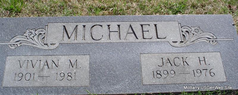 | MICHAEL, Jack H. | 1899 | 1976 | SSW: Vivian - Research Note: Son of Robert and Nancy (Arnold) Michael. - 1920 Census, Richwood, McDonald, Missouri - Robert Michael, head, age 63, born AR, father born MO, mother TN; Nancy E., wife, age 62, born TN, parents born TN; Jack, son, age 20, born MO; Vivan M., daughter-in-law, age 18, born MO, father born MO, mother KS. | Census Phyllis Long Photo Donna Cooper |