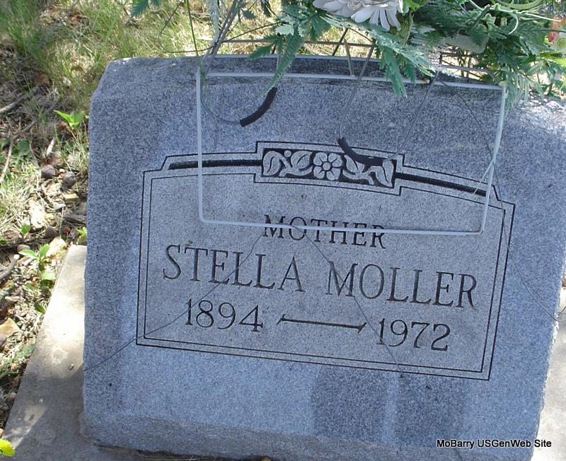 | MOLLAR, Stella (BRYSON) | 1894 | 1972 | Inscription: "Mother" - Research Note: Fred Moller married Stella Bryson on May 14, 1910 in Cassville, Barry Co., MO. Daughter of James Franklin Bryson and Leticia "Tisha" Sprinkles. Tisha died in 1898. - 1910 Census, Ash, Barry, Missouri - James Bryson, head, age 47, widowed, born KS, parents born TN; Stella, daughter, age 15, born MO, father born KS, mother TX; Mary, daughter, age 13, born MO; Theodosia, daughter, age 11, born MO. | Census MO Marriage Records Phyllis Long Photo Donna Cooper |