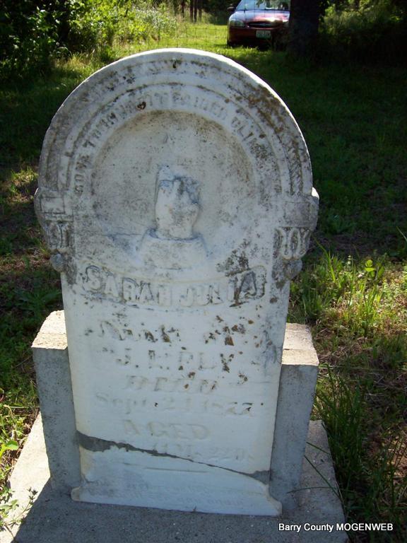 | FLY, Sarah Julia (BRACKET) | No Date | Sept. 24, 1877 | Inscription: "Wife of J. L. Fly" - Research Note: Headstone is in two pieces both lying on the ground. She was the 2nd wife of Jasper Lafayette Fly, buried at Purdy Cemetery, born 1850. They married Jan. 4, 1877 in Barry Co., MO. - Another Photo - Repaired stone by Jack Fly. | Headstone DC Howerton Note Nancy Wickam Photo Darla Marbut Photo Jack Fly |